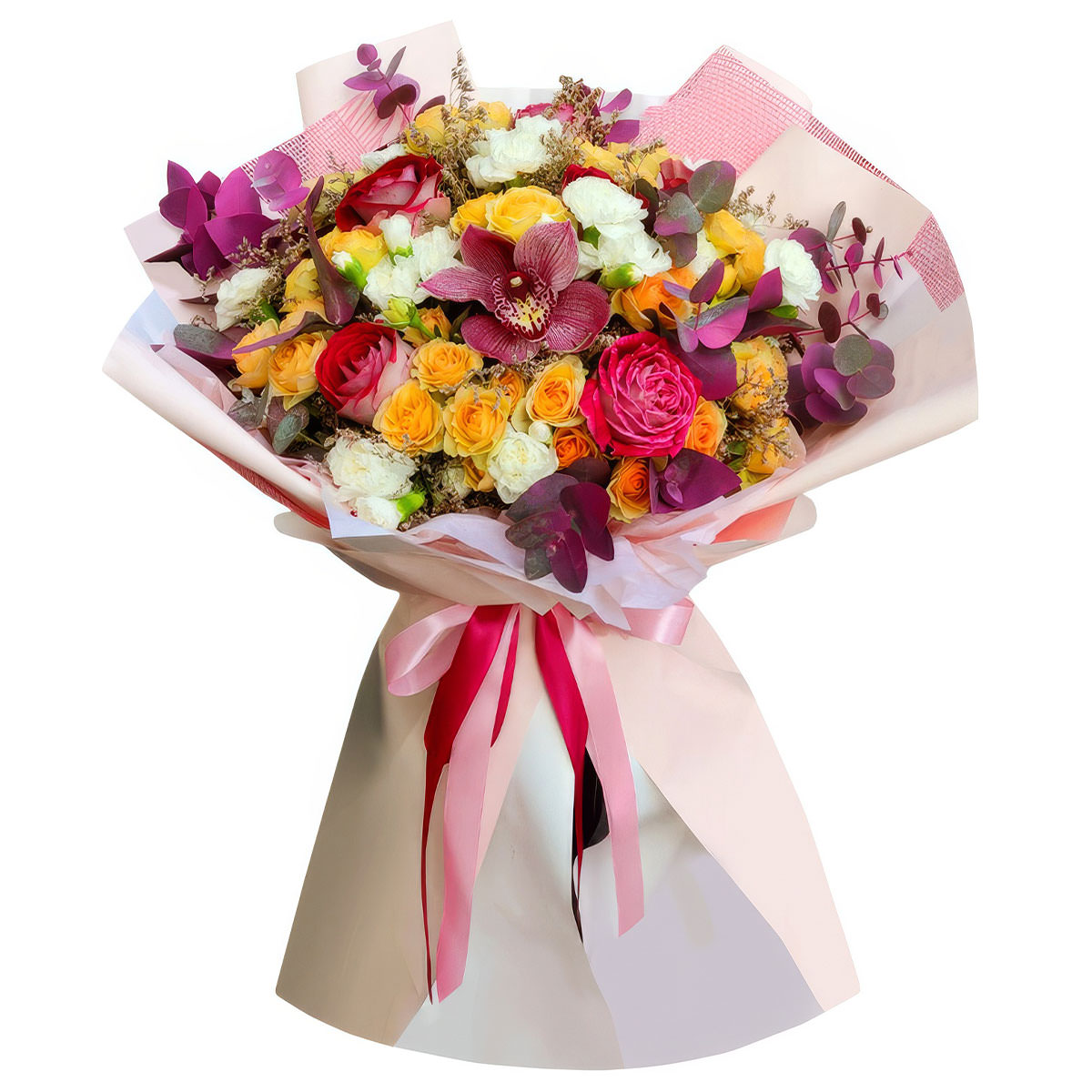 | Состав | Гвоздики, Кустовые розы, Орхидеи, Розы, Эвкалипт |