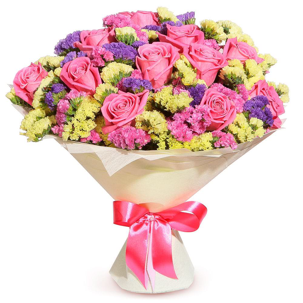 Роза одноголовая розовая, статица микс (желтая, фиолетовая). Упаковка (лента, пленка, крафт, сетка, пленка матовая)