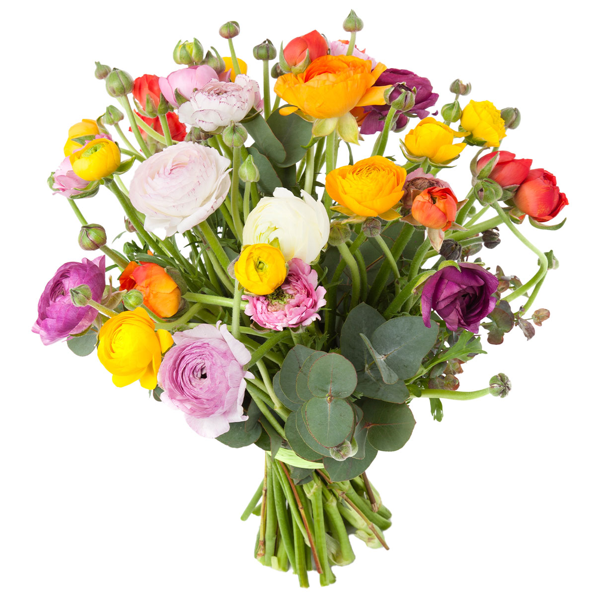 Ранункулюс желтый, оранжевый, розовый, сиреневый, эвкалипт. Упаковка (лента, пленка, крафт, сетка, пленка матовая)