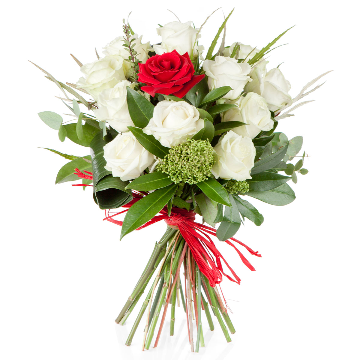 Роза одноголовая белая и красная, скиммия, эвкалипт, аспидистра. Упаковка (лента, пленка, крафт, сетка, пленка матовая)