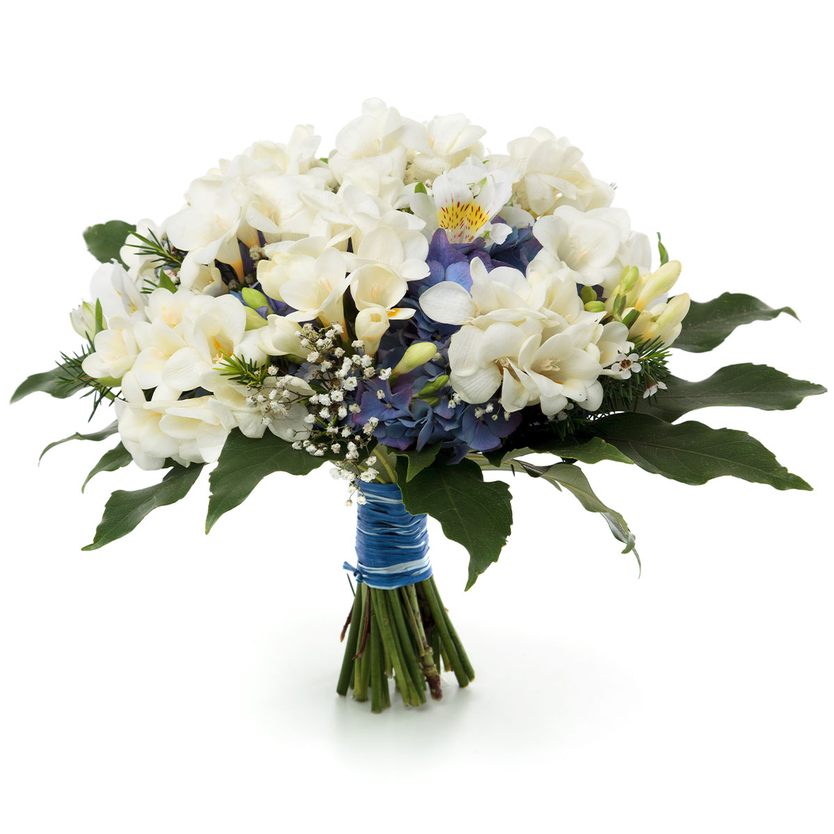 Фрезия белая, гортензия фиолетовая, альстромерия белая, ваксфлауэр, гипсофила, зелень. Упаковка (лента, пленка, крафт, сетка, пленка матовая)