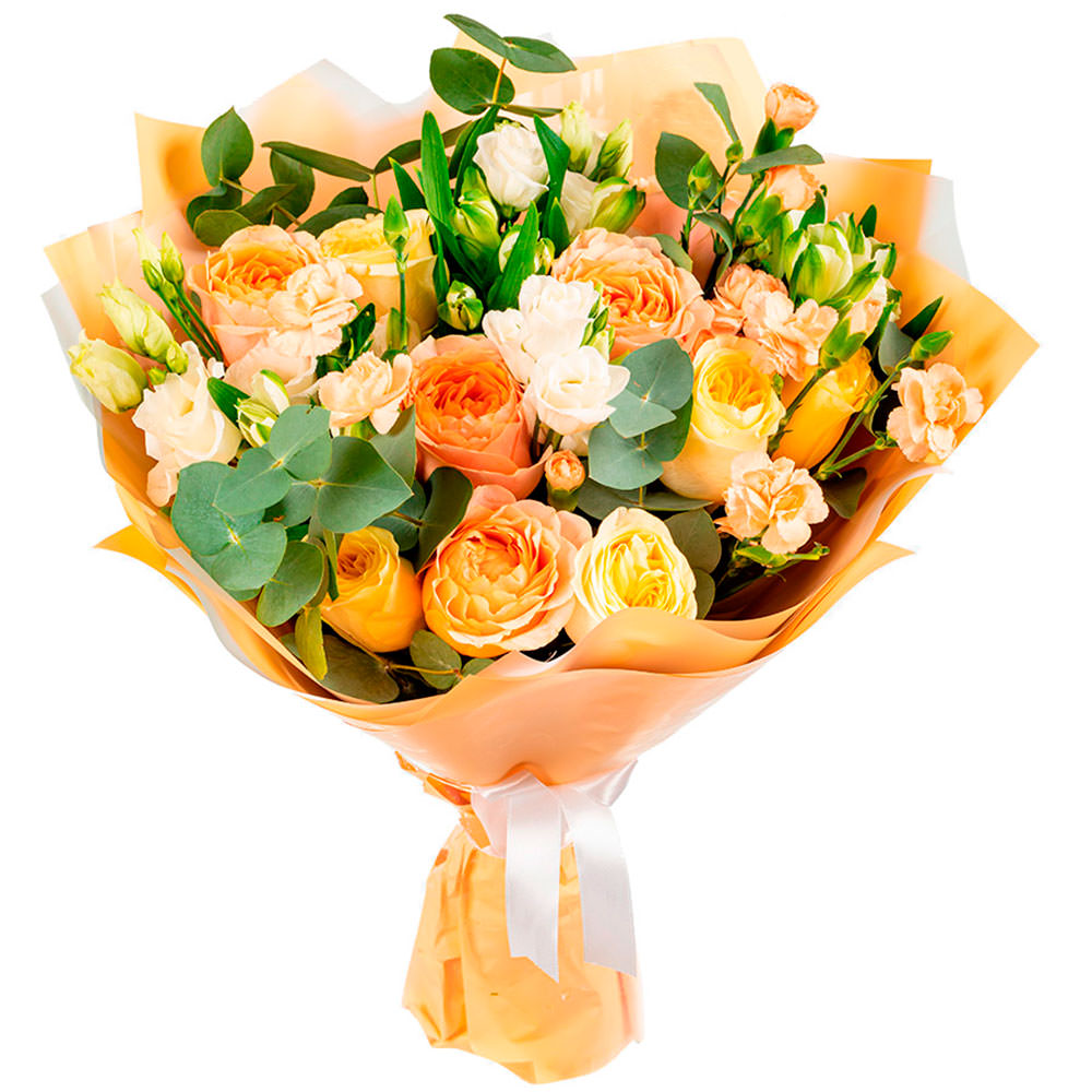Роза одноголовая пионовидная персиковая, эустома кремовая, гвоздика кустовая мини кремовая, эвкалипт. Упаковка (лента, пленка, крафт, сетка, пленка матовая)