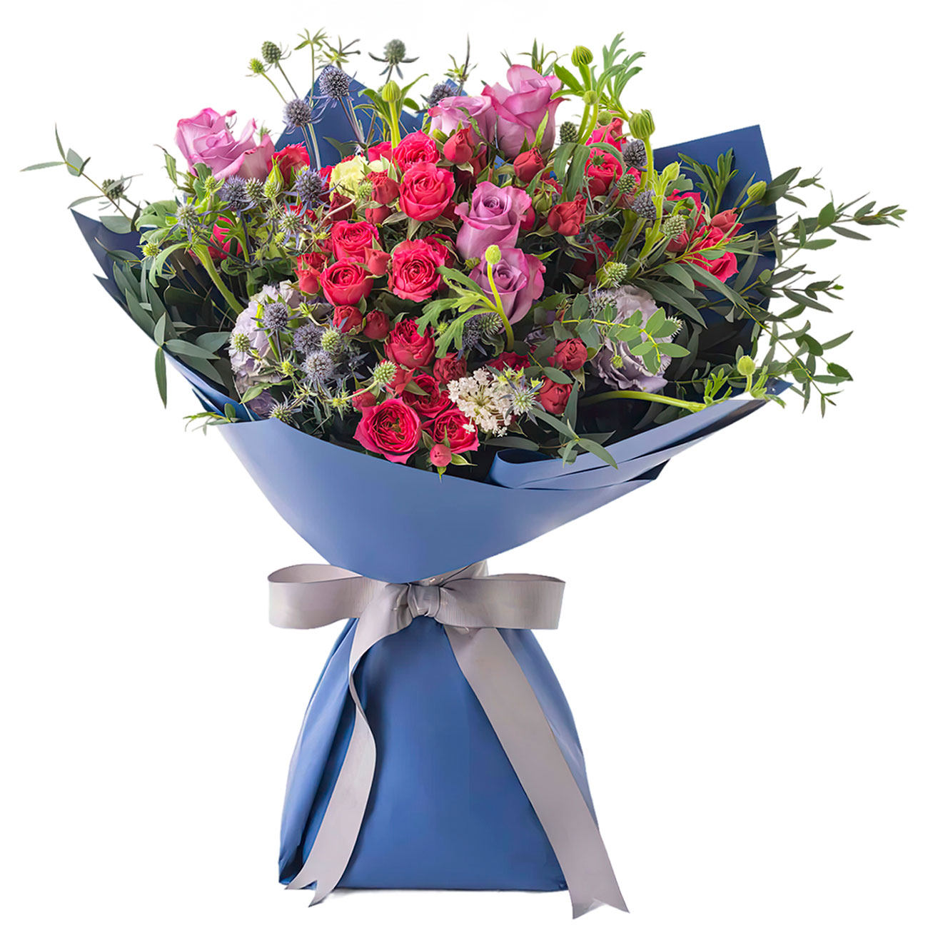 Роза фуксия кенийская, роза кустовая розовая кенийская, эрингиум, ананасовый цветок бело-синего цвета, эустома белая, зелень. Упаковка (лента, пленка, крафт, сетка, пленка матовая)