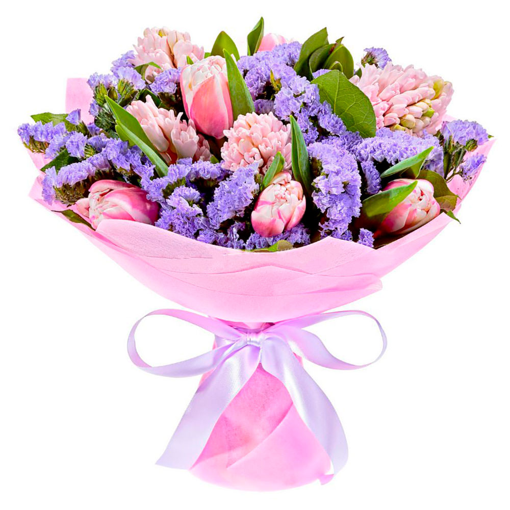 Тюльпан розовый, гиацинт розовый, лимониум, зелень. Упаковка (лента, пленка, крафт, сетка, пленка матовая)