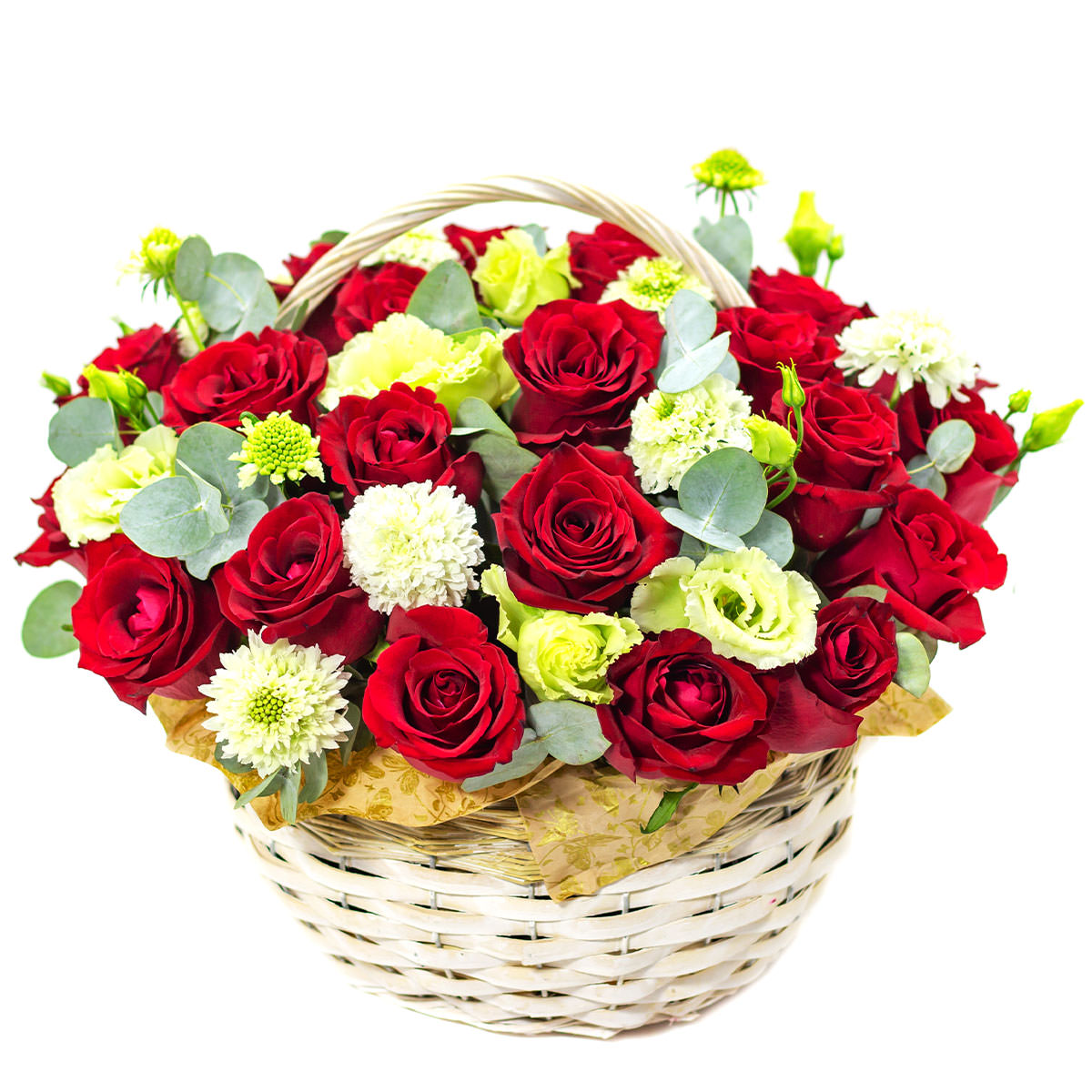 Роза одноголовая красная, хризантема кустовая белая, эустома желтая, эвкалипт. Упаковка (Корзина, оазис, ящик).