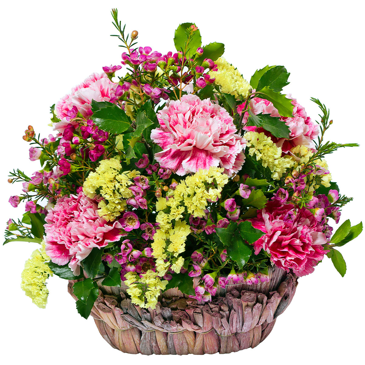 Пион кэнди страйп, ваксфлауэр, статица желтая. Упаковка (Корзина, оазис, ящик).