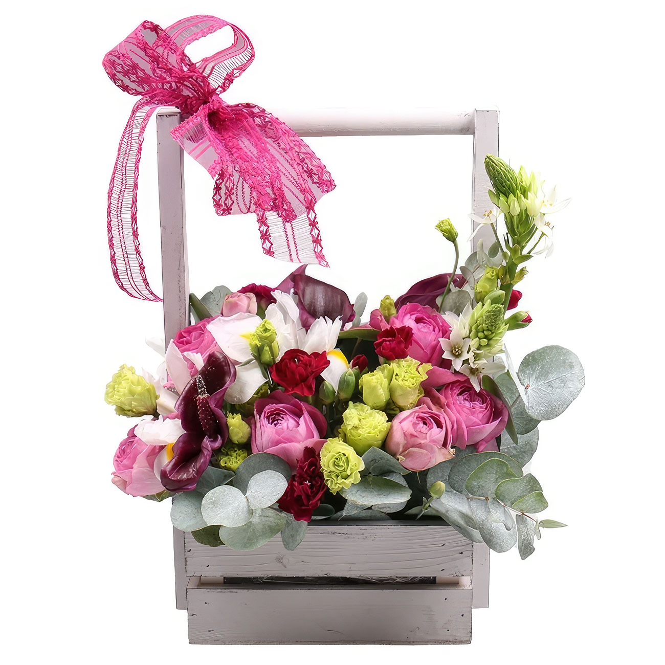Роза пионовидная розовая, эустома зеленая, ирис белый, гвозика кустовая мини красная, калла бордовая, эвкалипт. Упаковка (Корзина, оазис, ящик).