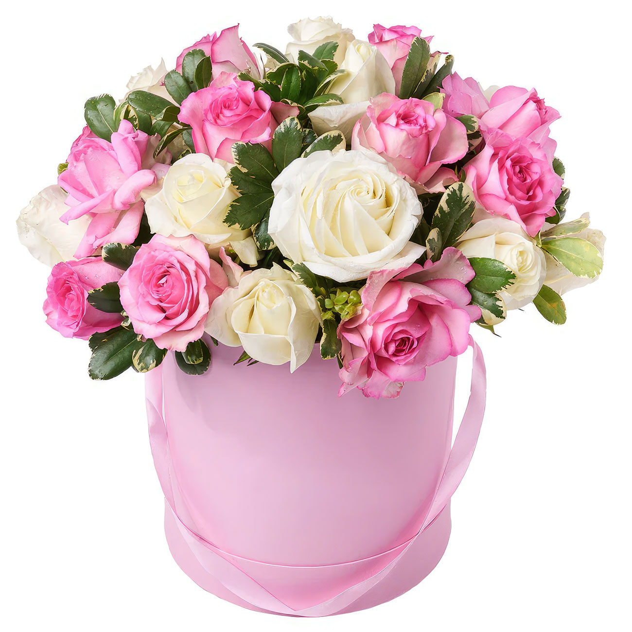 Роза одноголовая белая, розовая, зелень. Упаковка (шляпная коробка, квадратный бокс, коробка сердце, оазис)