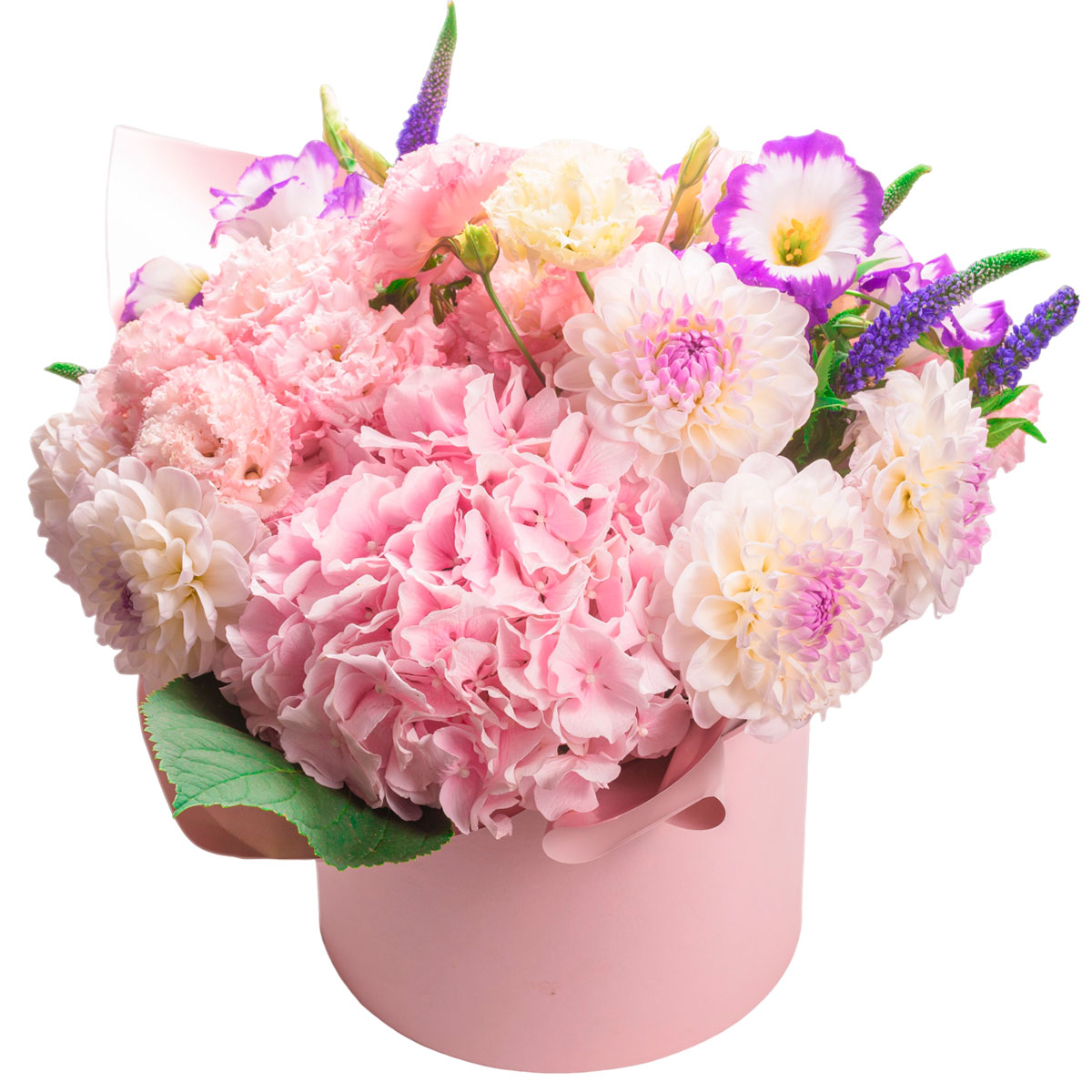 Гортензия розовая, георгина белая, эустома розовая и бело-фиолетовая, вероника. Упаковка (шляпная коробка, квадратный бокс, коробка сердце, оазис)