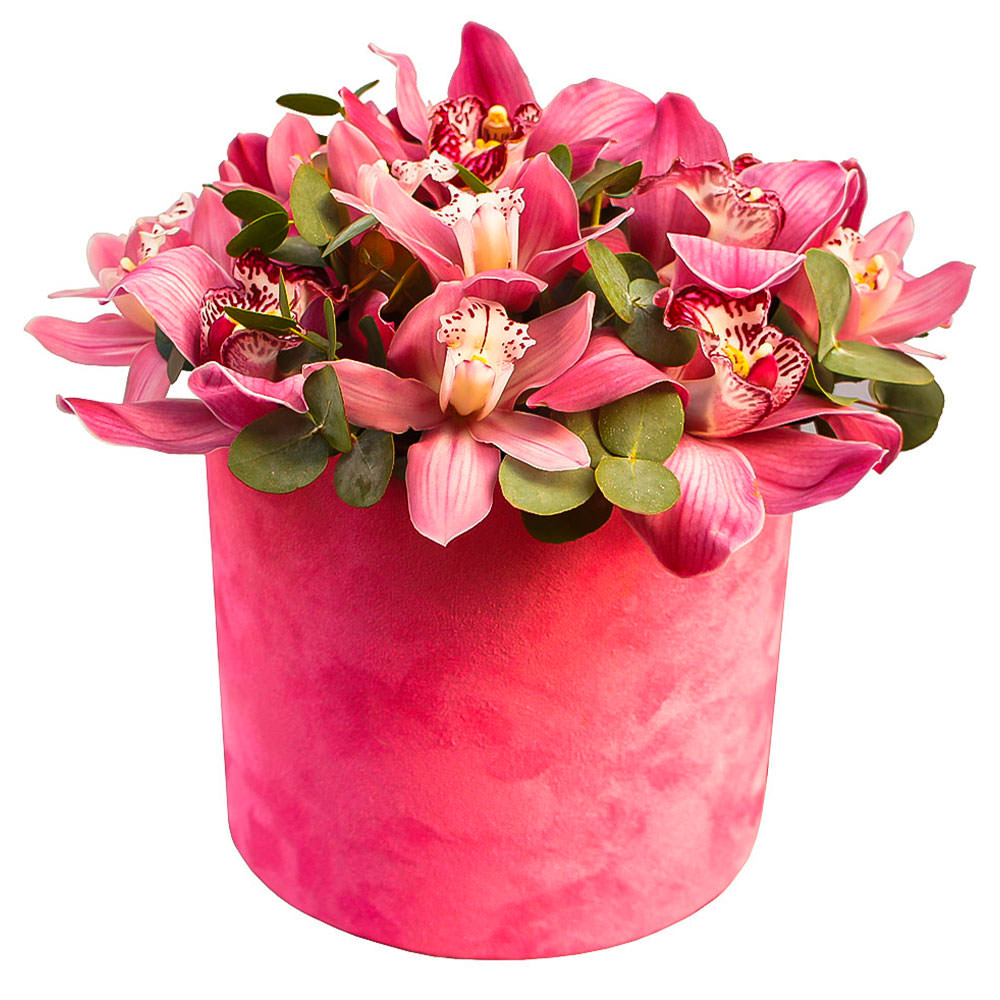 Орхидея розовая, эвкалипт. Упаковка (шляпная коробка, квадратный бокс, коробка сердце, оазис)