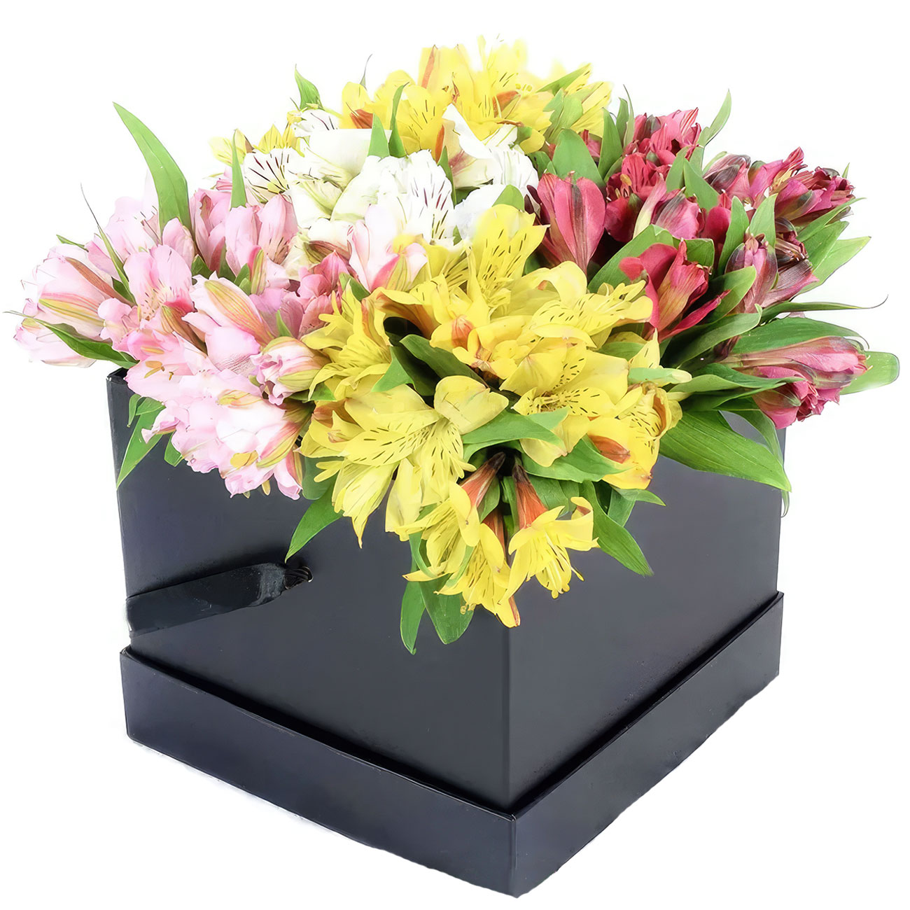 Альстромерия микс (желтая, розовая, красная). Упаковка (шляпная коробка, квадратный бокс, коробка сердце, оазис)