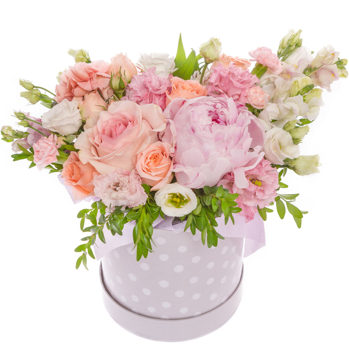 Пион розовый, роза одноголовая нежно-розовая, роза кустовая персиковая, гвоздика кустовая мини розовая, эустома белая и розовая, зелень. Упаковка (шляпная коробка, квадратный бокс, коробка сердце, оазис)